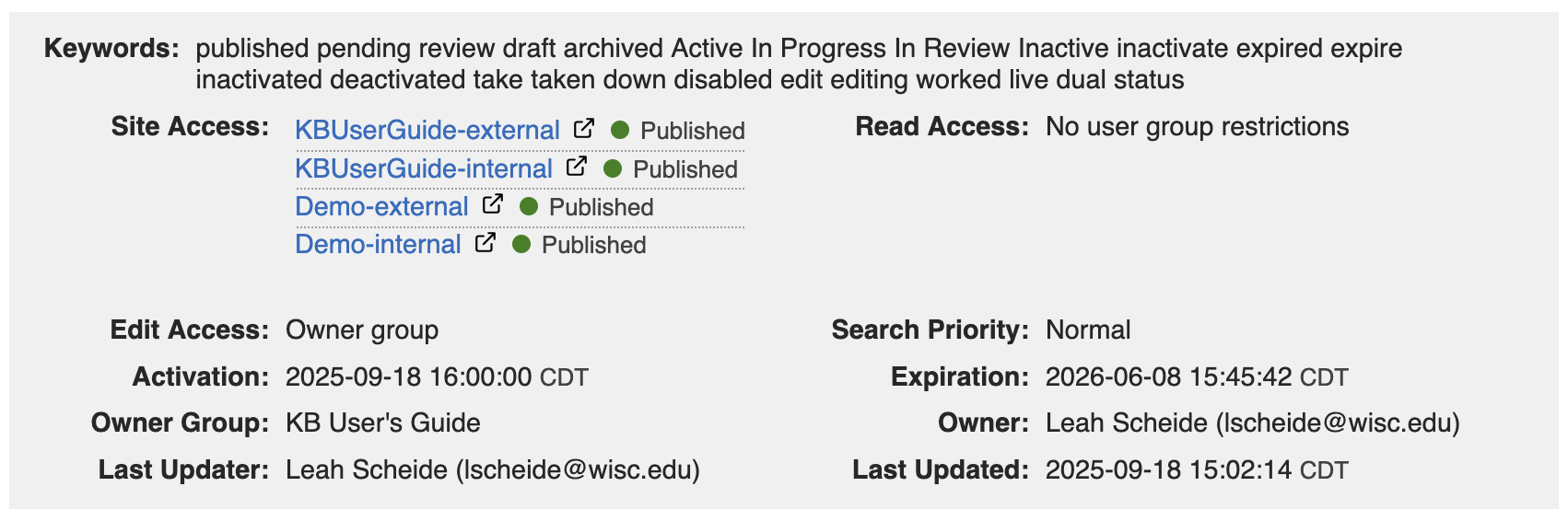 The document information section in the KB Admin Tools displays slightly different metadata, with a focus on information that is more relevant to those editing the document. This section (shown below) is found at the bottom of the page when viewing an individual document.