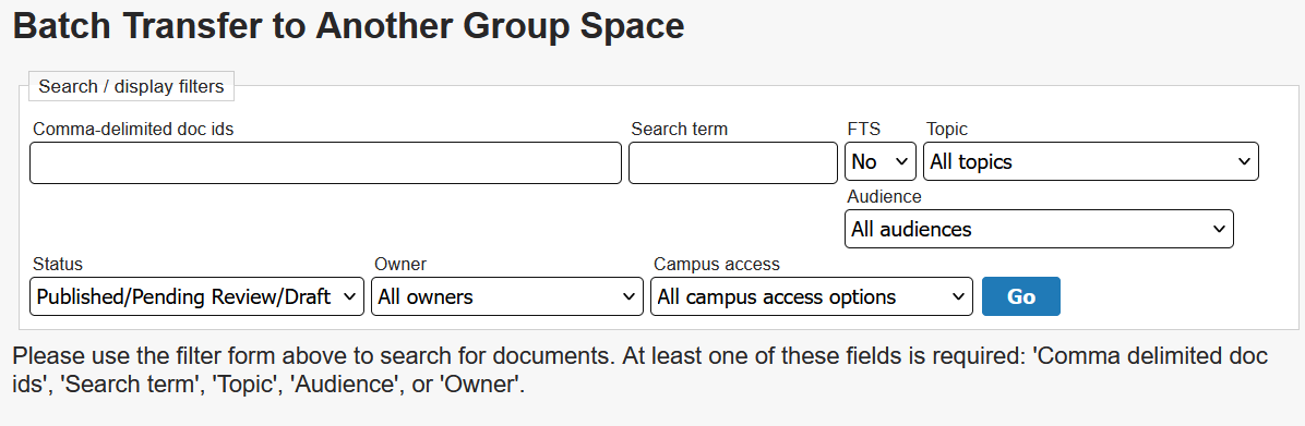 - This will lead you to the Batch Transfer to Another Group Space screen. The image below shows this screen and the search filters available to refine your document search.