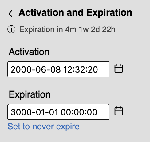 3. Your redirect will only work until the document Expiration date passes, so expand the Activation and Expiration section and set this as desired. In most cases, we recommend clicking the Set to never expire link to prevent the document from expiring. Doing so will set the expiration date of the obsolete document to 3000-01-01 00:00:00.